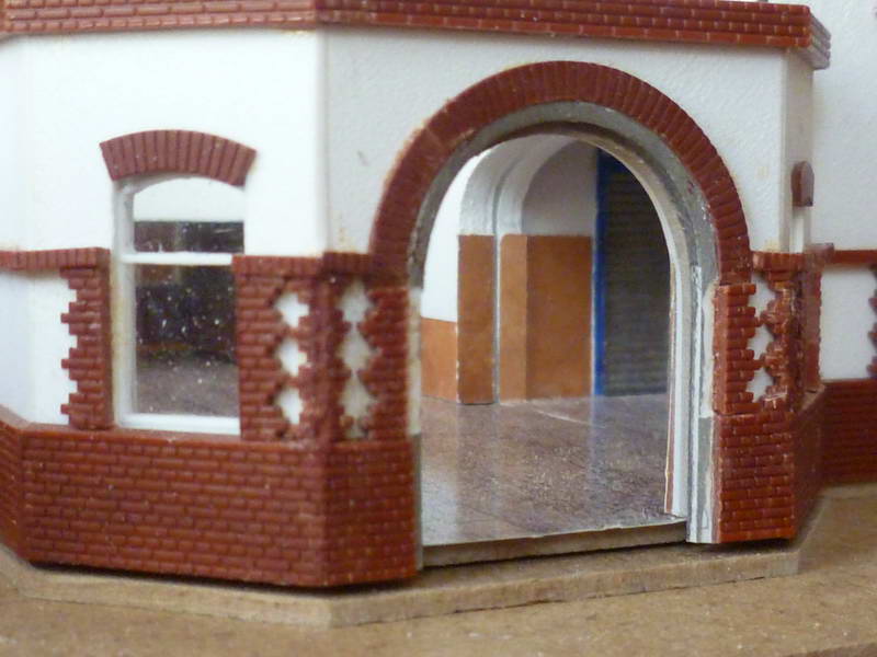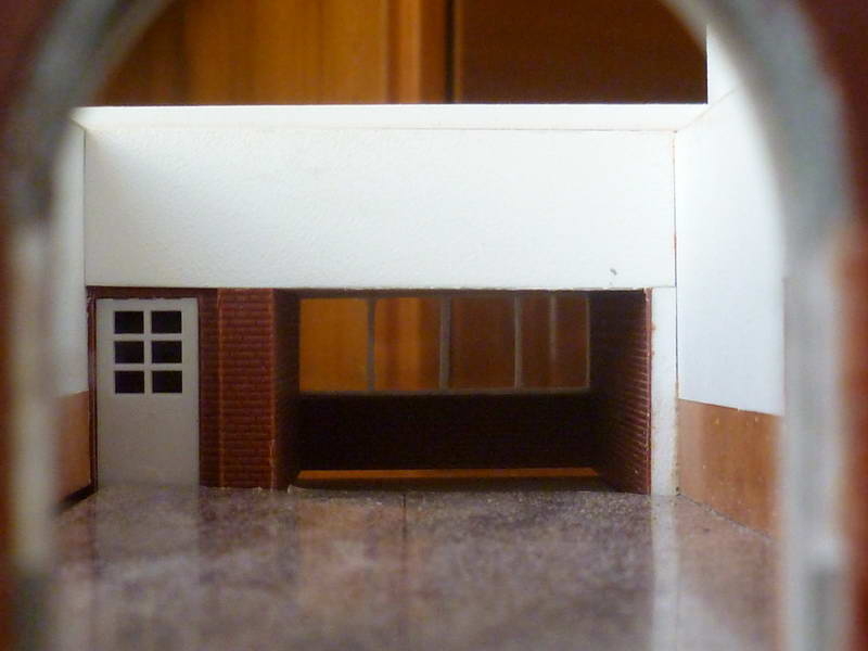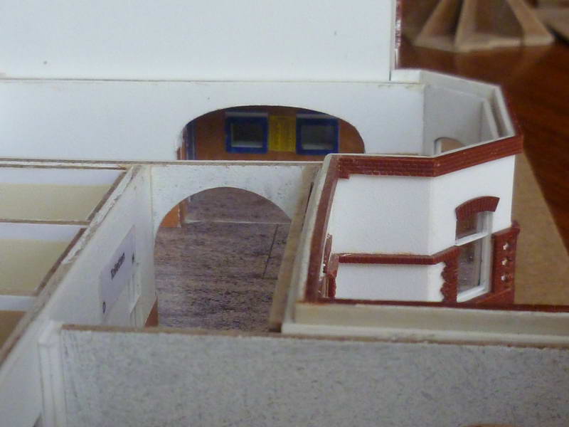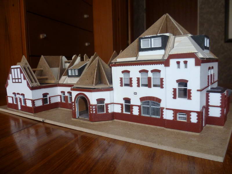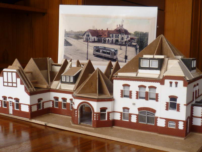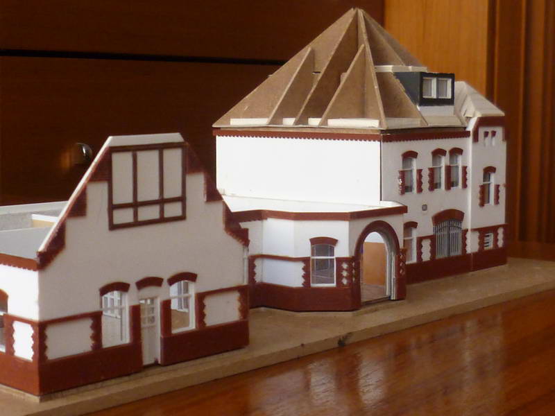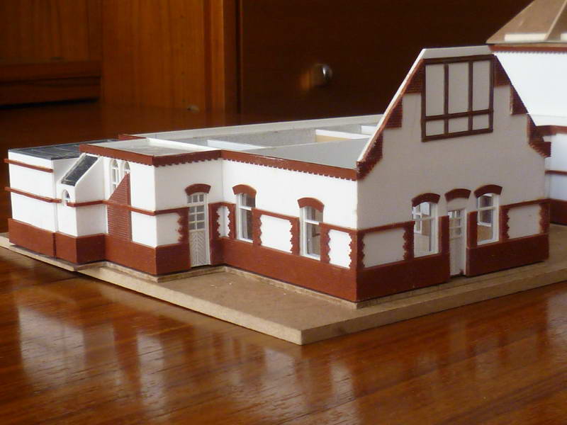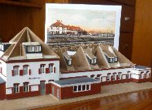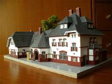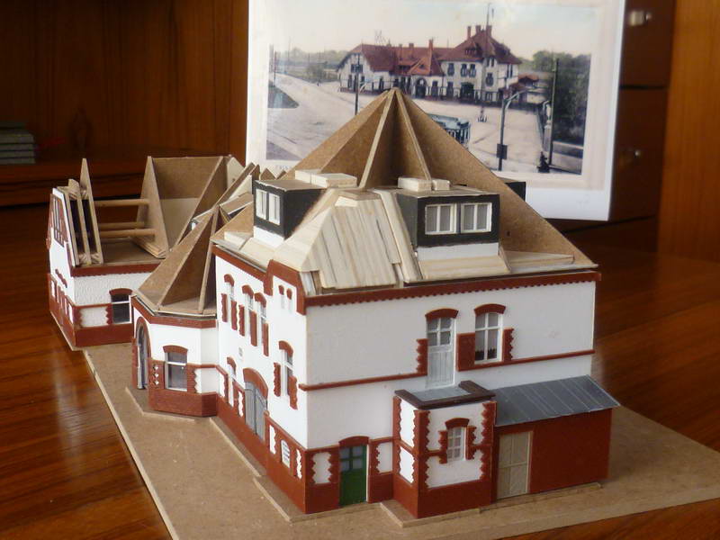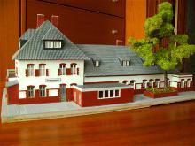 Ein Bahnhofsmodell, aus Holz gefertigt, war ursprünglich nur als grobes Standmodell geplant. Sozusagen als Standortmarkierung. Anlage. Gestaltet wurde dann doch ein detaillierteres Modell mit der in den 1970er Jahren hellen Farbgebung, Fenstern, Friesen, Schuppen, Anbauten und Plattierungen.