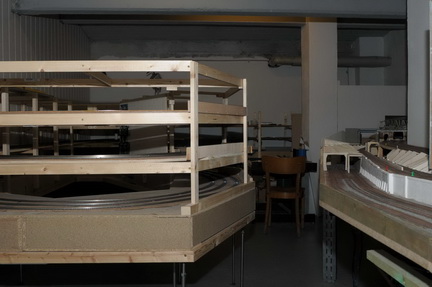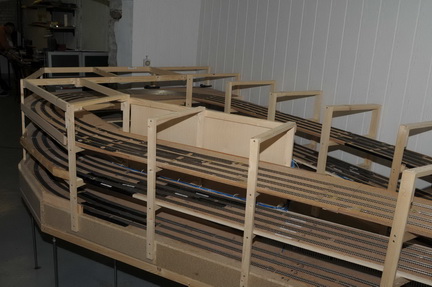 In den Schattenbahnhöfen werden nach Fertigstellung 220 m Gleis und 28 Weichen verbaut sein. Im Schattenbahnhof wurde nicht das Tillig Elite Gleis verwendet, sondern das Piko A - Gleis. Die Gleise sind in den beiden unteren Ebenen auf Kork verklebt, in der oberen dritten Ebene versuchsweise mit selbstentwickelten Schwellenhaltern befestigt.